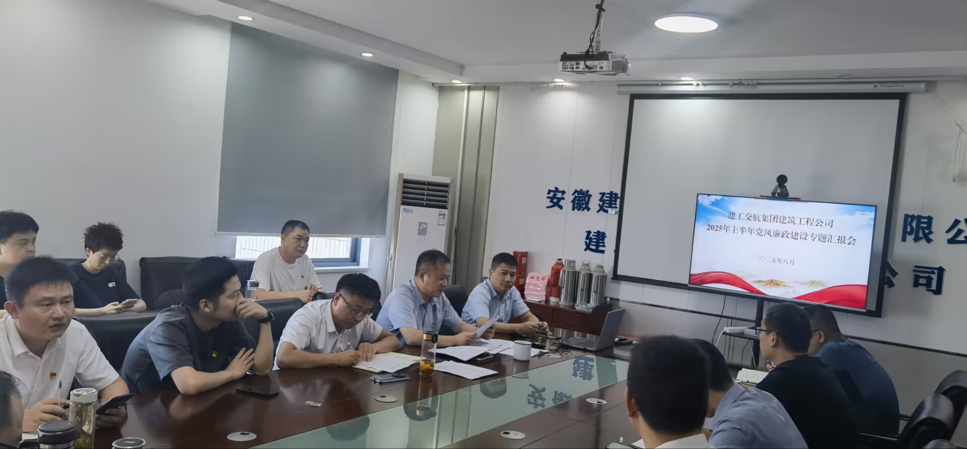 8 月 15 日下午,建筑工程公司以 “现场 + 视频” 形式,在五楼会议室召开 2025 年上半年党风廉政建设专题汇报会,公司领导班子成员、部门负责人、项目经理和全体党员参会。
