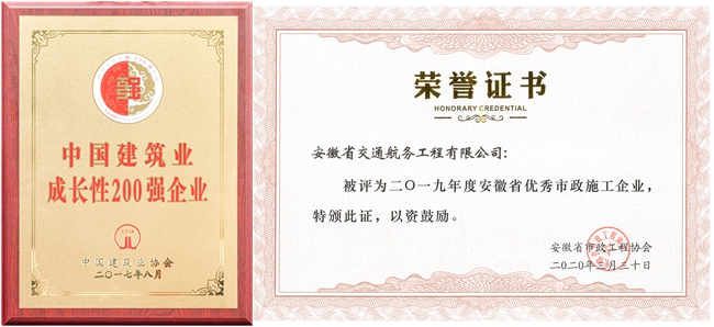 中国建筑业成长性200强企业、安徽省优秀市政施工企业
