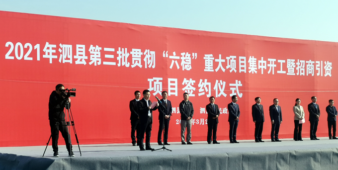 3月26日上午,由泗县2021年第三批贯彻“六稳”重大项目集中开工暨招商引资项目签约仪式在安徽交航参建的泗县长三角绿色农产品加工物流产业园施工现场举行。宿州市市委常委、泗县县委书记张志强,宿州市政协副主席、泗县县委副书记、县长王法立,县委副书记王汝娜及泗县农业农村局等领导出席开工仪式。公司财务总监高伟应邀出席,并与泗县主要领导共同为项目奠基。