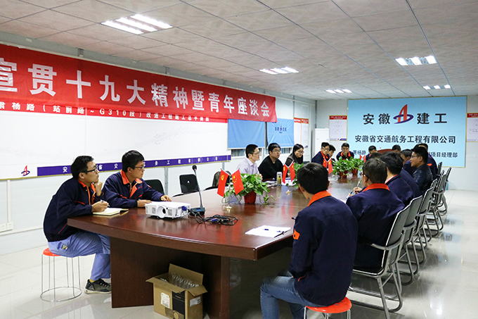 11月8日,安徽交航党委副书记、常务副总经理方申柱先后赴淮北市中湖矿山地质环境治理PPP工程项目、萧县萧杨路(站前路~G310段)改造工程项目宣讲党的十九大精神,并在各自项目部驻地召开青年座谈会,倾听青年心声、了解青年需求;公司副总经理汪崇龙,党委委员、总经理助理邵佳,党委办公室、经营公司有关人员以及项目部全体职工聆听宣讲、参加座谈。