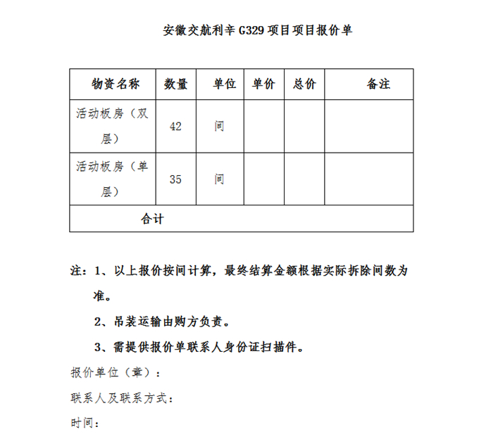 我公司位于亳州市利辛县G329项目有一批废旧活动板房需处置(共计77间,2266.3㎡),现公开向社会寻求收购,欢迎有意向者参与。