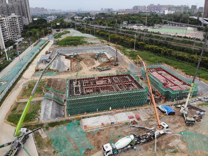 进入安徽交航公司板桥河项目施工现场,机械轰鸣,车辆穿梭,一片井然有序的繁忙景象。两台泵车正在进行格栅间及进水泵房沉井混凝土浇筑,东侧工人师傅们在吊车的配合下,正在绑扎隔油沉砂池顶板钢筋,北侧两台挖掘机正在开挖调蓄池土方,旋挖钻机正在进行围护桩作业。