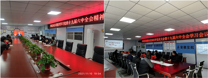 党的十九届六中全会是我党在“两个一百年”奋斗目标历史交汇期上召开的一次重要会议。党的十九届六中全会召开后,安徽交航公司党委高度重视,第一时间召开会议学习贯彻党的十九届六中全会精神,将学习贯彻党的十九届六中全会精神作为当前和今后一个时期内的重要政治任务,并将学习贯彻十九届六中全会精神与党史学习教育、与学习贯彻省十一次党代会精神结合起来,按照学懂弄通做实的要求,确保十九届六中全会精神入脑入心、走深走实。公司所属各单位迅速行动,结合工作实际,广泛组织开展学习,掀起了学习宣传贯彻十九届六中全会精神的热潮。