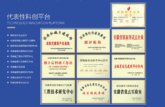 产学研合作和科技创新平台数量实现新突破。加强与高校之间的产学研合作,建立产学研深度融合的技术创新体系,合作模式不断创新。先后与合肥工业大学、安徽建筑大学、安徽理工大学等单位建立产学研合作平台,搭建了安徽省产学研联合培养研究生示范基地。以项目研究为纽带,大力推进科技创新平台建设,激发创新活力。先后建设了以中国合格评定国家认可委员会认可实验室(CNAS认可)、国家级高新技术企业、安徽省绿色建材评价机构、绿色建筑与装配式建造安徽省重点实验室、安徽省企业技术中心、安徽省博士后科研工作站为代表的11个科研创新平台。截至“十三五”末,安徽建科共有各类科技创新平台17个。