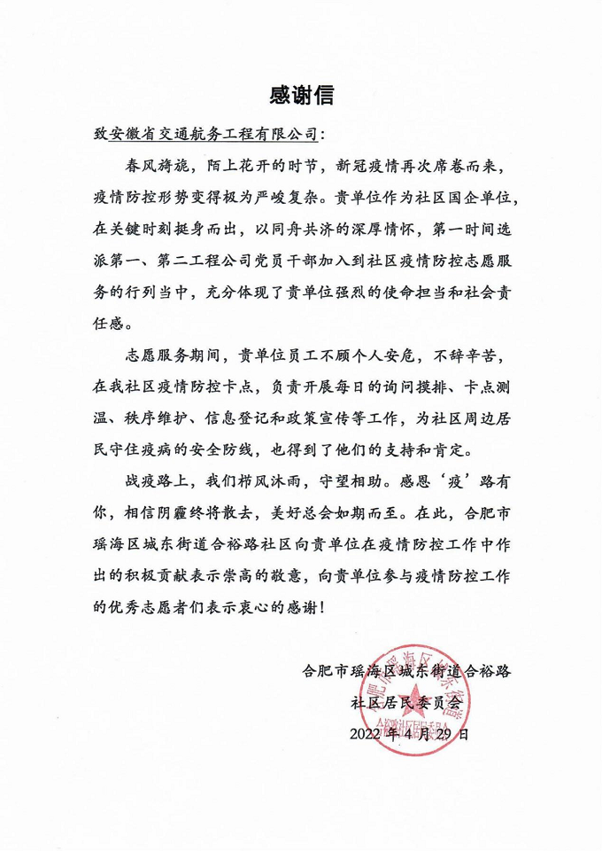 “第一时间选派第一、第二工程公司党员干部加入到社区疫情防控志愿服务的行列当中,充分体现了贵单位强烈的使命担当和社会责任感。”4月29日,公司收到了一封来自合肥市瑶海区城东街道合裕路社区的感谢信,信中对公司积极参与社区疫情防控工作表示由衷感谢。