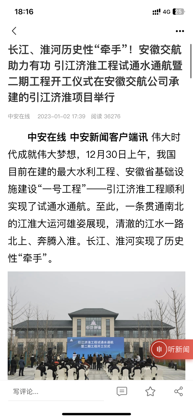 1月2日,中安在线客户端、官方网站发布报道引江济淮工程试通水通航暨二期工程开工仪式在安徽交航公司承建的引江济淮项目举行,目前累计阅读量超3.6万。