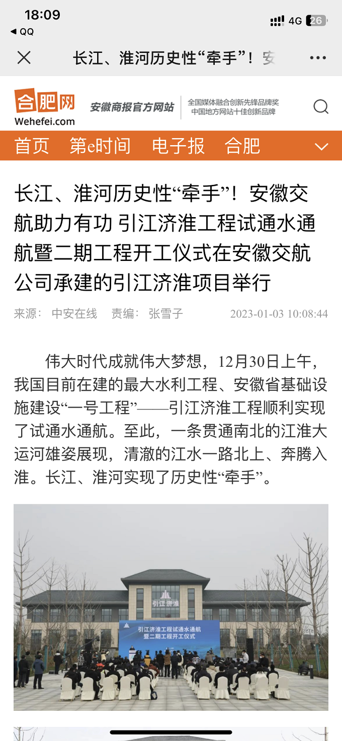 1月3日,安徽商报发布报道引江济淮工程试通水通航暨二期工程开工仪式在安徽交航公司承建的引江济淮项目举行。