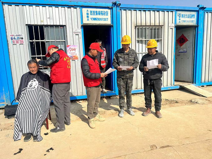 潭冲河家园项目发动青年志愿者们为项目工人发放文明宣传手册,讲解宣传合肥市民公约(守则),同时团支部组织志愿者服务活动,为工人提供义务理发。