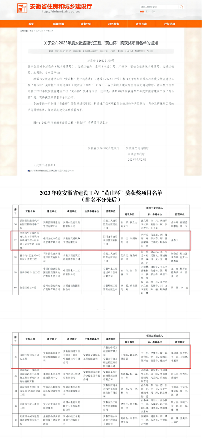 7月25日,省住建厅公布2023年度安徽省建设工程“黄山杯”奖获奖项目名单,建工交航承建的亳州市中心城区铁路以东3号地块市政路网工程项目以及参建的水阳江宣州综合码头工程位列榜单、喜获殊荣。