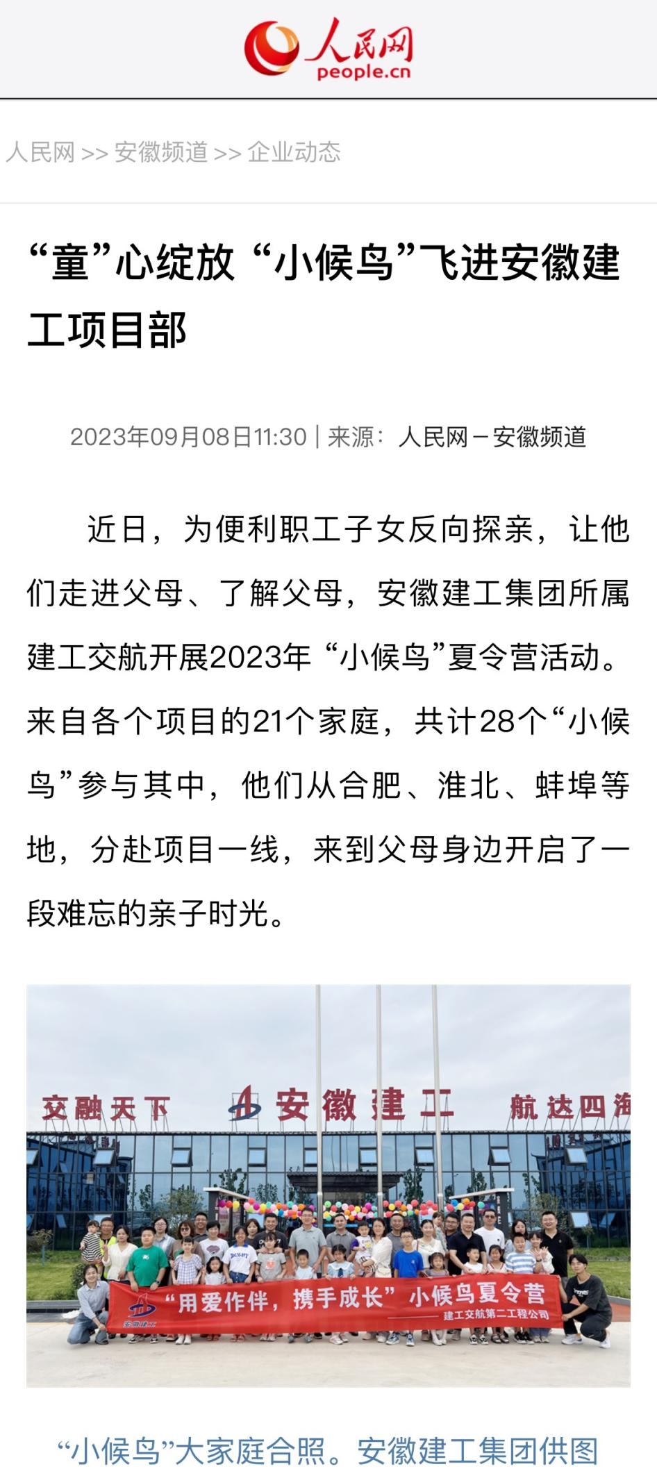 人民网安徽频道以《“童”心绽放“小候鸟”飞进伟德源自英国始于1946项目部》为题,报道建工交航“小候鸟”夏令营活动。