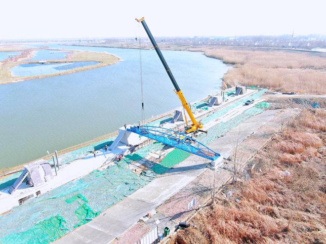 12月21日,沱浍河航道蚌埠段整治工程施工02标项目固镇闸下锚地顺利完成了钢引桥吊装施工,标志着该单位工程主体建设全部完成,全面进入收尾阶段。