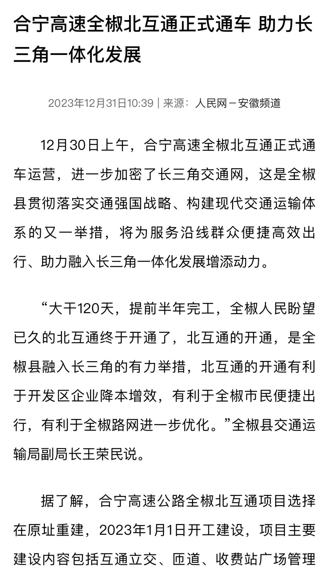 人民网安徽频道以《合宁高速全椒北互通正式通车 助力长三角一体化发展》为题,报道合宁高速公路全椒北互通项目通车仪式的举行。