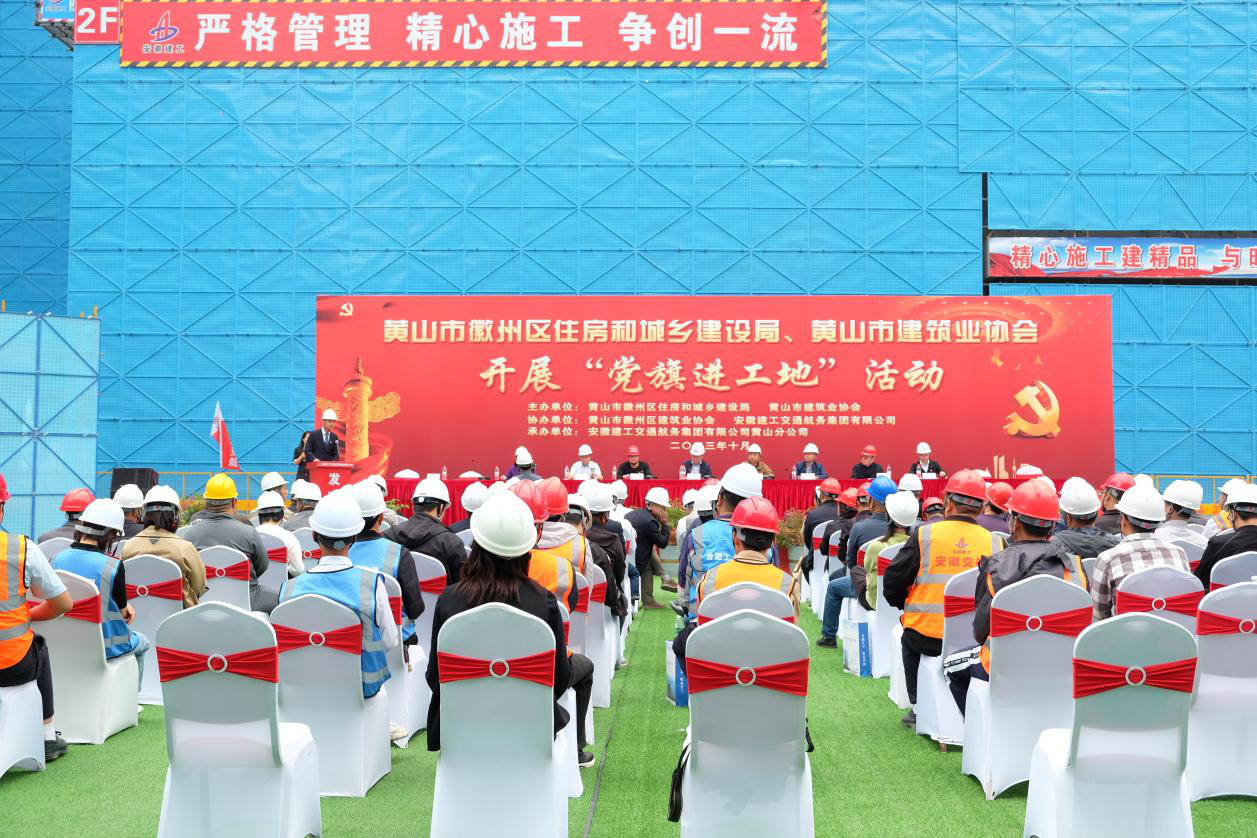 为扎实推进党建与项目建设深度融合,充分发挥党建引领作用。10月13日,建工交航徽州区城东粮食仓储物流产业园项目作为市建筑协会、徽州区住建局选定项目,顺利承办“党旗进工地”活动。黄山市工商联机关党委书记、二级调研员张玉明,市建管处安全办负责人石锐,徽州区住建局党组成员、质监站站长朱仁德,徽州区城投公司总经理潘立军,市建筑业协会党支部书记、秘书长程文华,徽州区建筑业协会会长李苏云等领导出席活动。