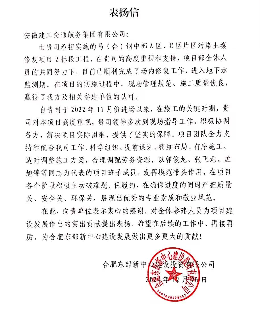 马(合)钢中部A区、C区片区污染土壤修复项目2标段工程积极主动破难题、保履约,提前谋划、精心布局、有序施工,严把质量关、安全关和环保关,展现出优秀的专业素养和敬业风范,收获业主单位合肥东部新中心建设投资有限公司表扬。