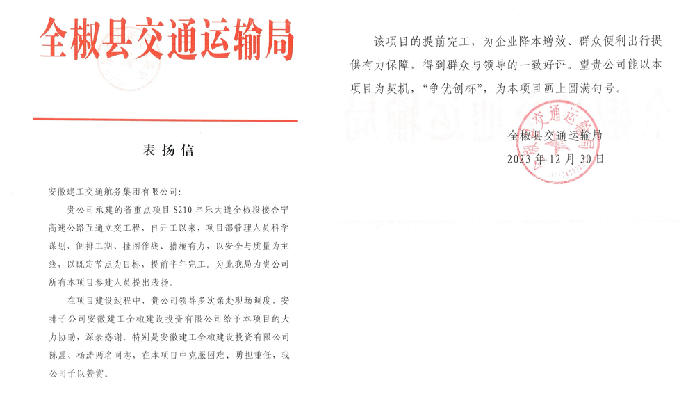 近日,公司承建的马(合)钢项目、S210丰乐大道全椒段接合宁高速公路互通立交项目和利辛双创产业园项目喜获表扬信。