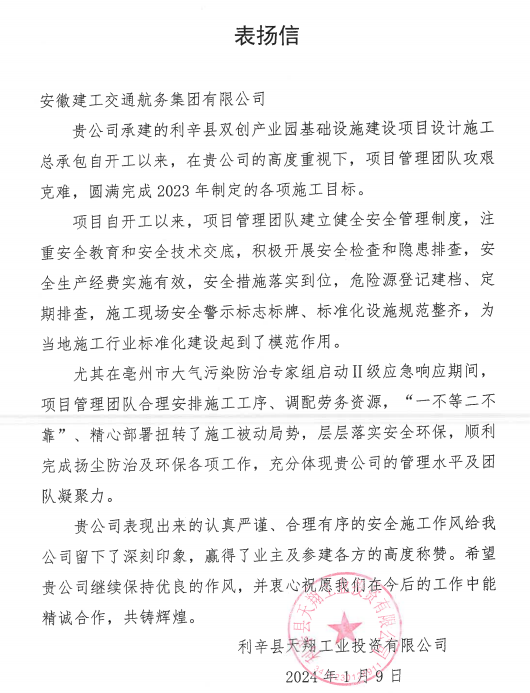 利辛双创产业园基础设施建设项目在亳州市大气污染防治专家组启动Ⅱ级应急响应期间,项目管理团队合理安排施工工序、调配劳务资源,“一不等二不靠”、精心部署扭转了施工被动局势,层层落实安全环保,顺利完成扬尘防治及环保各项工作,收获业主单位利辛县天翔工业投资有限公司表扬。