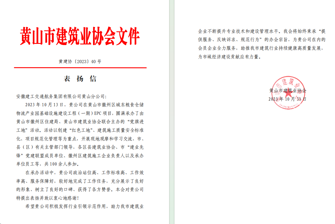 10月31日,建工交航黄山分公司收到黄山市建筑业协会发来的表扬信。信中对黄山分公司在所属徽州区城东粮食仓储物流园项目圆满承办“党旗进工地”活动予以充分肯定。