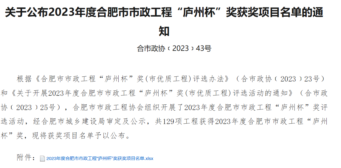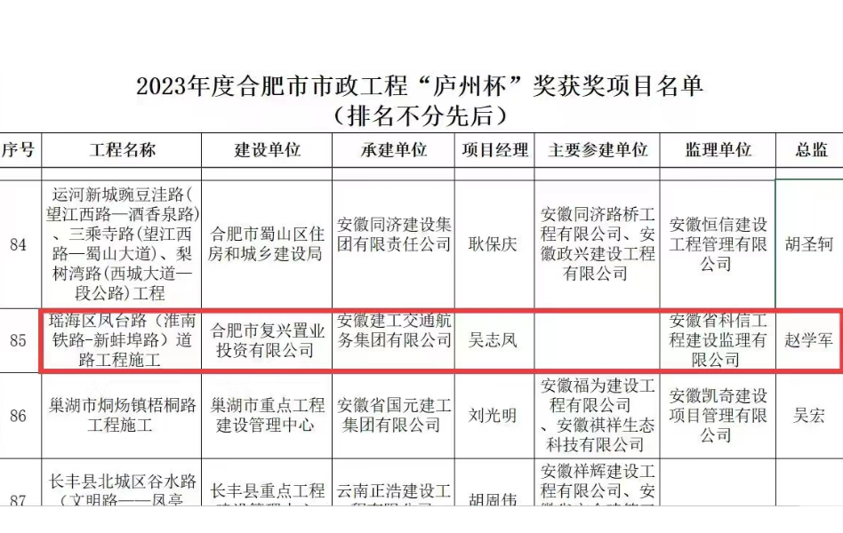 近日,2023年度合肥市市政工程“庐州杯”奖已公示完毕,建工交航承建的瑶海区凤台路(淮南铁路-新蚌埠路)道路工程市政项目顺利通过评审,荣获该奖项。“庐州杯”奖是由合肥市市政工程协会组织评审,经合肥市城乡建设局审定,是合肥市市政工程建设领域最高质量奖。
