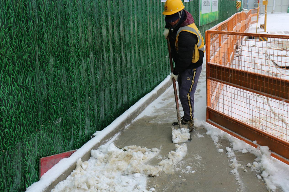 再次面对寒潮,商机厂租赁住房项目第一时间组织人员清理办公区、生活区、施工现场道路的积雪,铺设防滑草袋,确保恶劣天气条件下项目各工作安全有序推进。