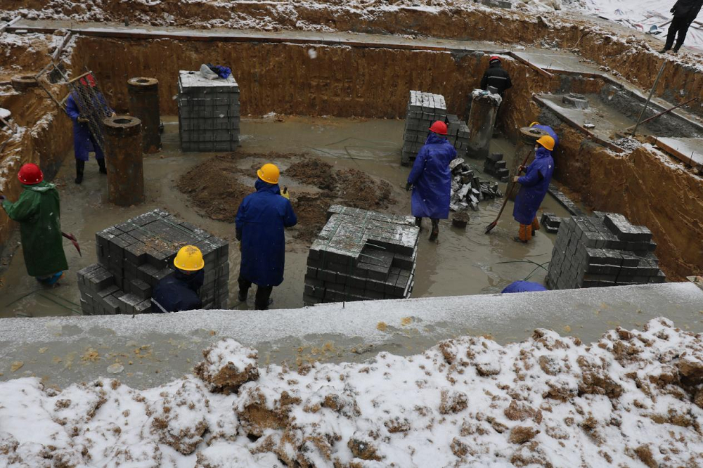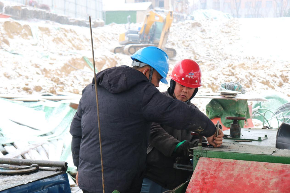 项目部结合实际开展安全施工教育培训,有效推进现场桩芯钢筋加工制作、础砖胎膜抹灰、砌筑、道路铺设砖渣、地库承台桩芯浇筑等生产工作,确保降雪降温不降产。