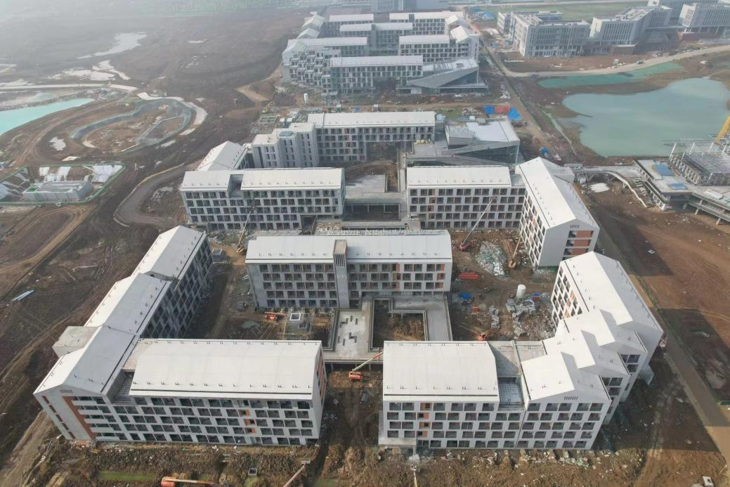 安徽医科大学新医科中心(新校区)一期项目一批次建安工程施工及总承包服务项目位于位于合肥市肥西县独秀园与李陵山路交口东北角,建筑面积约20万㎡,合同额约3.7亿元。主要建设内容包括D-1生活组团、D-2生活组团等土建、装饰和安装工程。自复工以来,项目紧锣密鼓推进施工任务,目前主体结构已全部完成,外墙装饰完成90%,内装饰瓷砖完成95%,机电安装完成80%,累计完成产值3.05亿元。项目建设过程中克服了合同节点时间紧、施工任务艰巨等诸多困难。项目建成后,将对接长三角一体化发展战略,打造“政产学研用”一体化新校区,形成“学科+产业+专业”的医学科创集群。