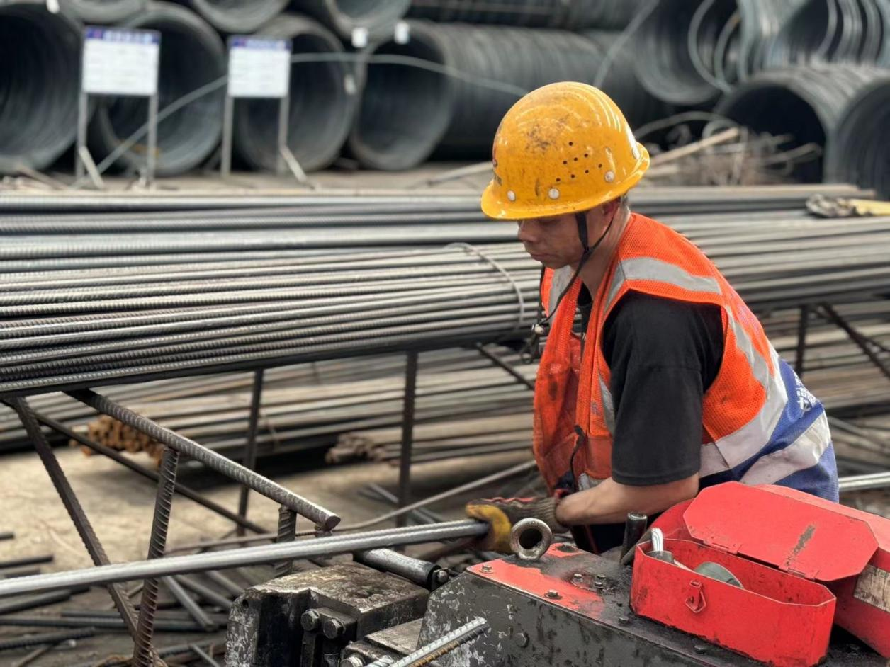 ▲徐淮阜高速项目-互通钢筋厂工人进行钢筋加工预弯