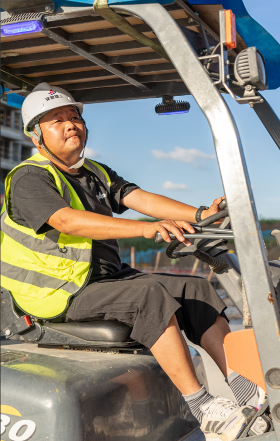 驾驶着叉车的张智,正忙着进行砖块的搬运和装卸工作。面色坚定,汗水从额头上流下,但他丝毫没有懈怠,始终保持着专注与严谨的态度,确保每一项任务的安全与高效完成。