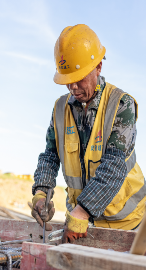 暴晒下的钢筋表面十分烫手,站在边上都能感觉到热度。来自六安的程振合和李中俊作为钢筋工能手正头顶烈日,在钢筋丛林中“穿针引线”。李中俊一手固定住钢筋,一手熟练地用工具把钢筋绑扎好。这样的动作,他每天都要重复无数次。