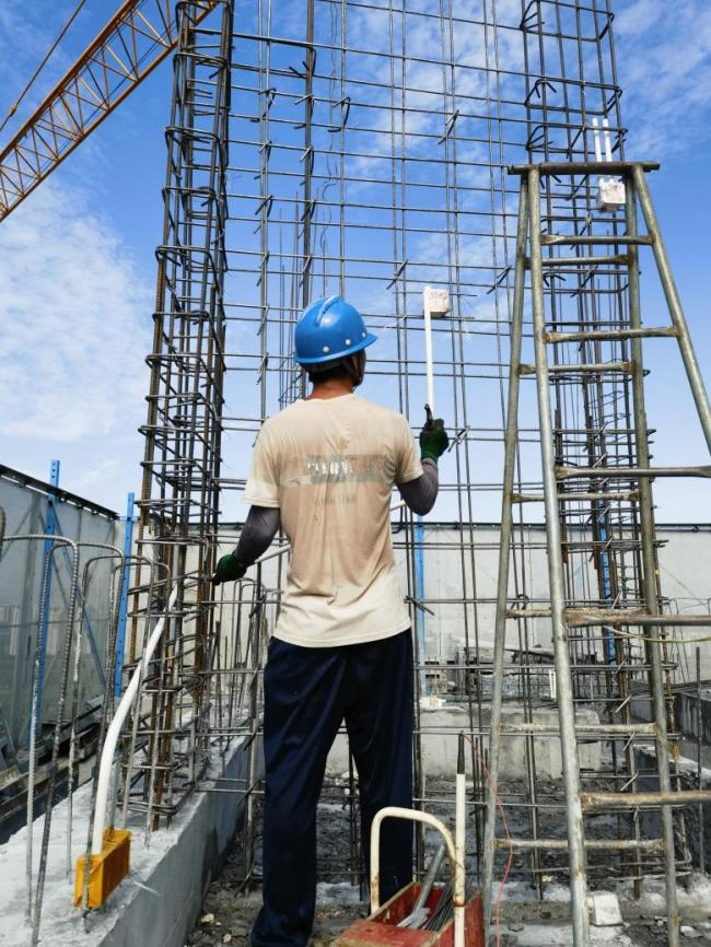 已经被汗水浸湿衣服的小伙是水电工王双军,他正在密密麻麻的墙柱钢筋中布置线管。