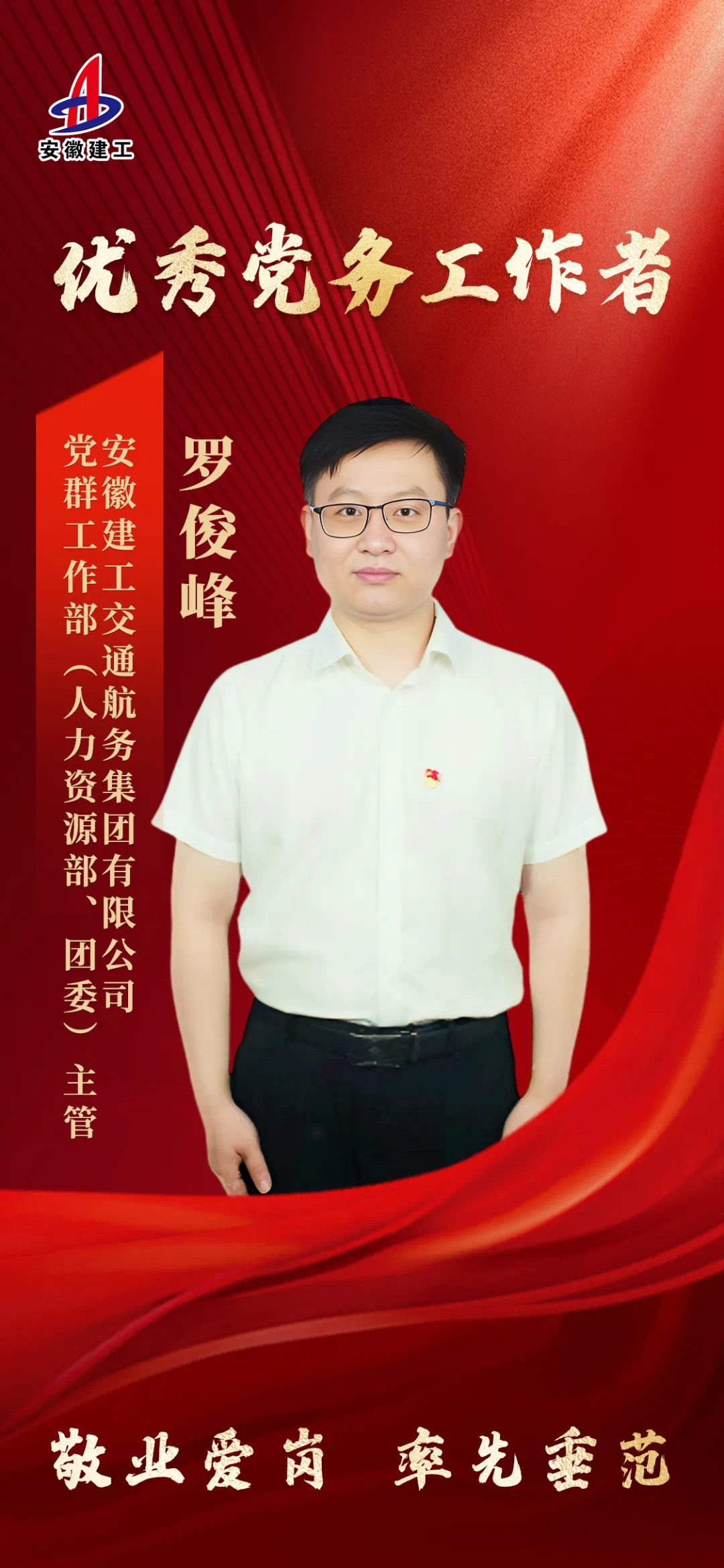 罗俊峰,男,中国共产党党员,政工师,现任建工交航党群工作部(人力资源部、团委)主管。作为一名基层党务工作人员,该同志具有高度的责任感和强烈的事业心,敢于担当作为,勤勉敬业,较好完成各项工作任务,受到公司党委及职工群众的一致好评。始终勤于学习,刻苦钻研,持续强化政治理论武装,努力将理论与工作实践相结合,不断提高履职能力;立足本职,以制度建设为抓手,扎实做好基层党建、精神文明建设、组织人事等各项工作,多次获评公司及集团先进生产者称号;该同志坚持履职尽责,敢于战斗,在集团内部巡察、省委巡视、公司党委换届以及深化改革等重点工作期间,连续奋战,较好完成工作职责,充分发挥模范带头作用。