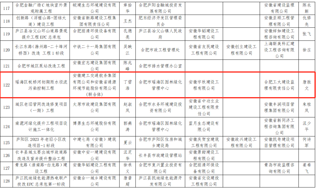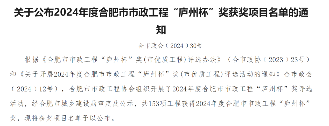 近日,经合肥市城乡建设局审定,合肥市市政工程协会正式公布2024年度合肥市市政工程“庐州杯”获奖项目名单,我公司承建的瑶海区板桥河初期雨水径流污染控制工程项目顺利通过评审,榜上有名。