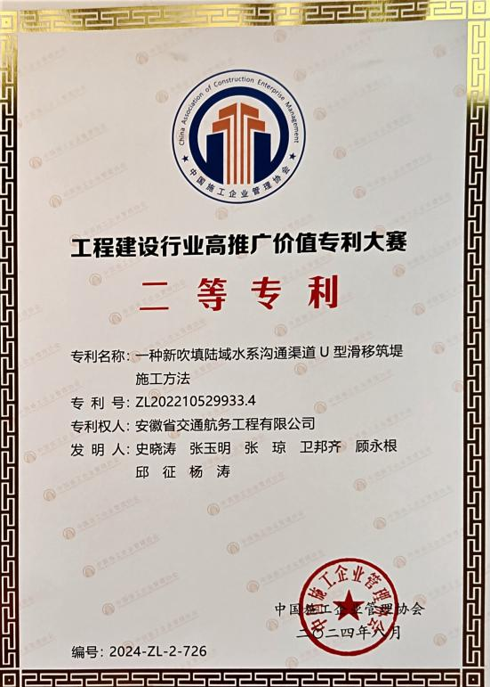 在工程建设行业高推广价值专利大赛中,公司申报的“一种新吹填陆域水系沟通渠道U型滑移筑堤施工方法”发明专利荣获二等奖。