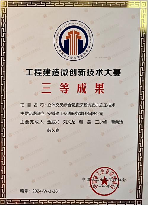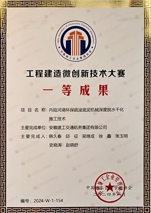在工程建造微创新技术大赛中,公司申报的“内陆河湖环保疏浚底泥机械深度脱水干化施工技术”和“立体交叉综合管廊深基坑支护施工技术”分别荣获一等奖和三等奖。