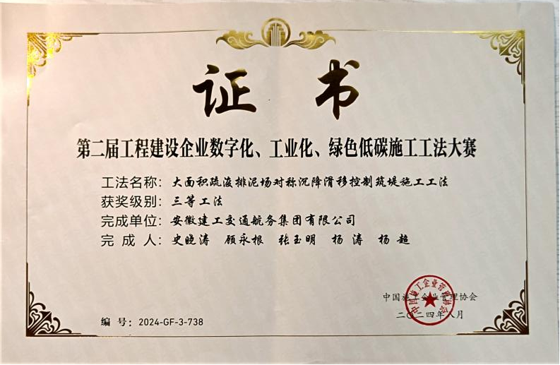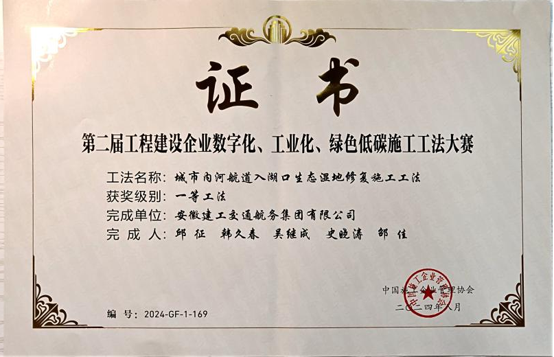 在工程建设企业“数字化、工业化、绿色低碳”施工工法大赛中,公司申报的“城市内河航道入湖口生态湿地修复施工工法”、“自浮装配式土工管袋充灌操作平台与隔污系统施工工法”、“重金属污染土壤异位淋洗施工工法”、“大面积疏浚排泥场对称沉降滑移控制筑堤施工工法”分别荣获一等奖、二等奖、三等奖。