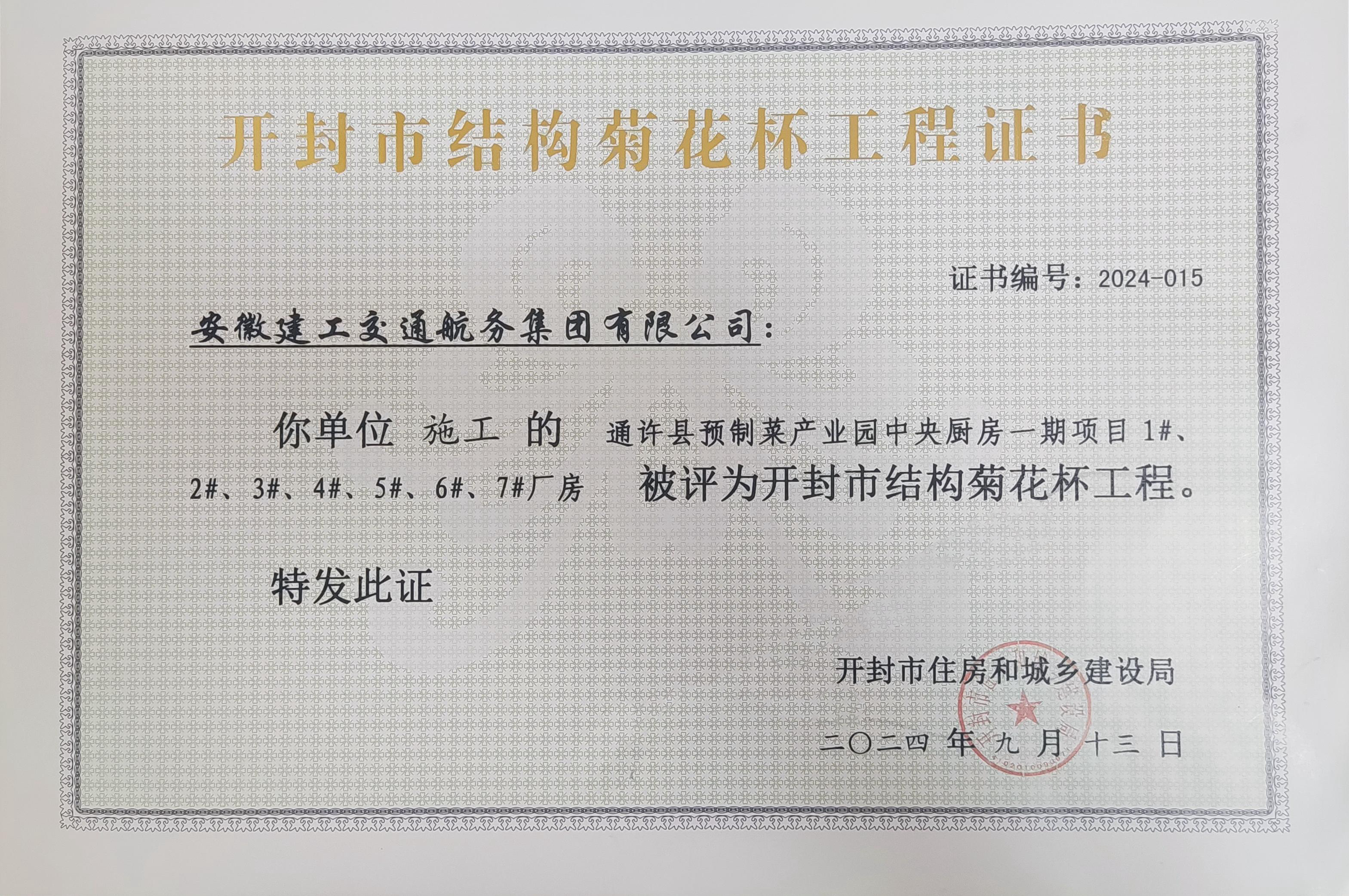 近日,开封市住房和城乡建设局公示了2024年度上半年开封市“结构菊花杯”工程获奖名单,由伟德源自英国始于1946承建的通许县预制菜产业园中央厨房一期项目荣获此称号。