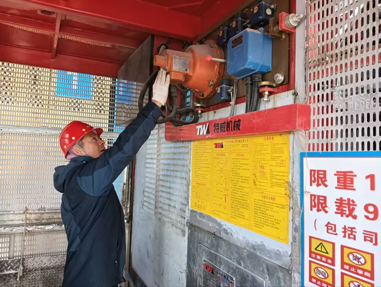 建工交航安全环保监察部联合设备专家组成检查小组,深入各在建项目施工现场,对塔吊的基础稳定性、塔身垂直度、各部件连接螺栓紧固情况进行详细检查,同时查看维护保养记录,确保设备维护保养工作按规定执行。对施工升降机的防坠安全器、上下限位开关、楼层防护门等关键安全装置进行逐一测试,不放过任何一个安全细节。