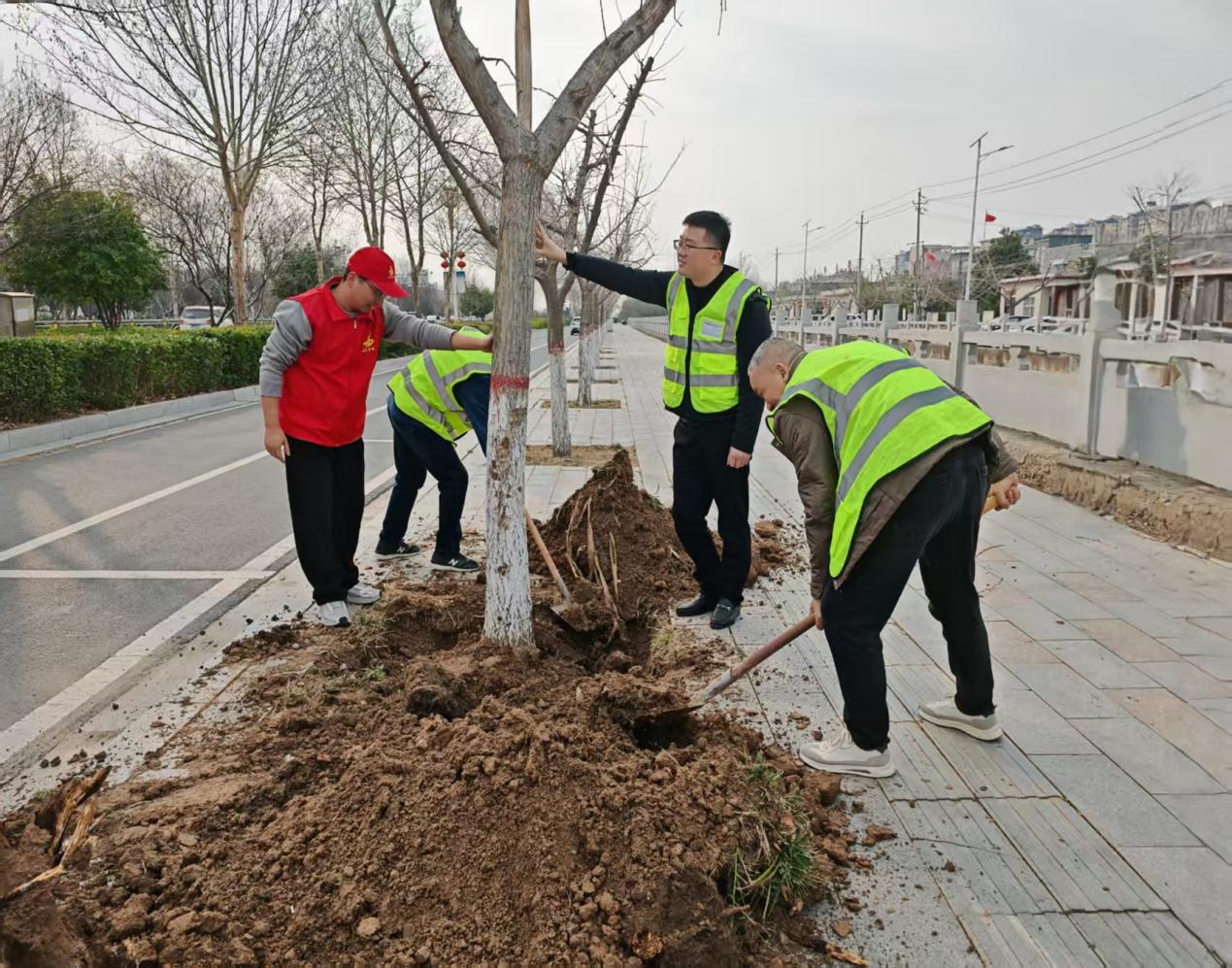 活动现场,党员干部们热情高涨、干劲十足。大家分工协作,挥锹培土、扶苗围堰、提水浇灌,每一道工序都一丝不苟。经过数小时的辛勤劳动,共栽培、修复树木20余株,为初春的大地增添了一抹盎然绿意。
