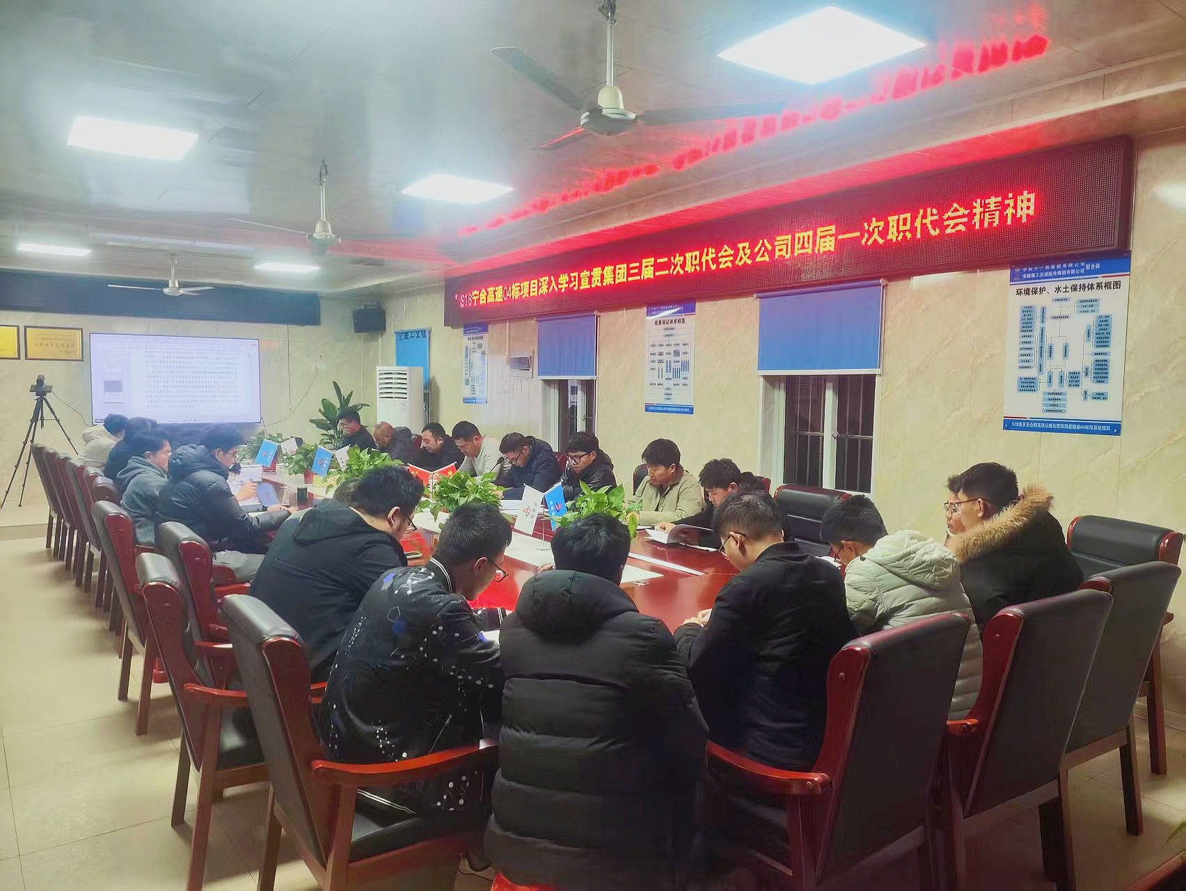s18宁合高速项目迅速行动,组织项目全体人员召开会议,对集团、公司两级职代会精神进行宣贯,并对项目下一阶段工作进行布置。要求全体人员自觉对标对表,瞄准目标,强化管理,确保效益与安全双提升,为推动集团和公司的高质量发展贡献更大力量。