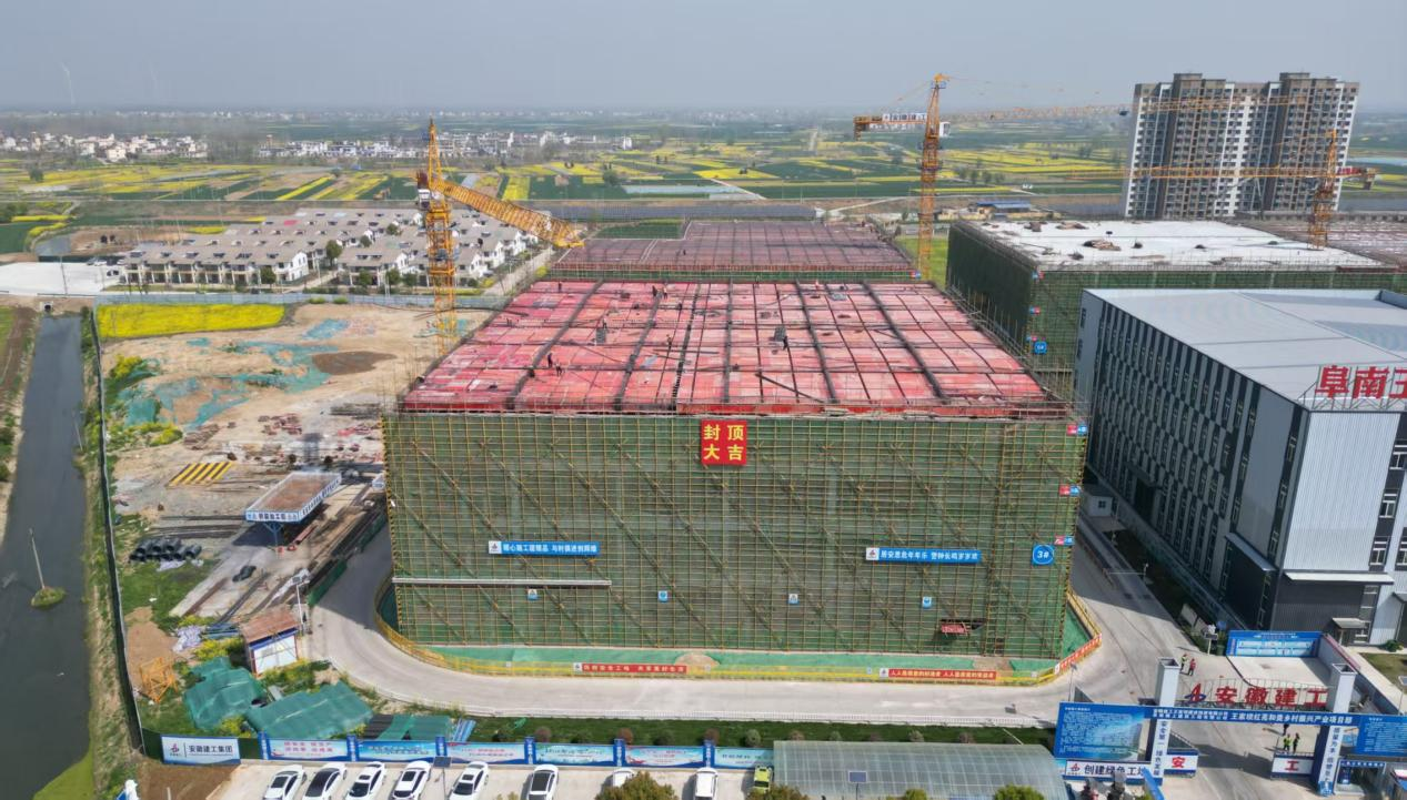 4 月 2 日,随着最后一方混凝土浇筑完成,王家坝红亮和美乡村振兴产业项目 5# 厂房主体结构顺利封顶,标志着阜南县乡村振兴重点工程取得阶段性胜利。