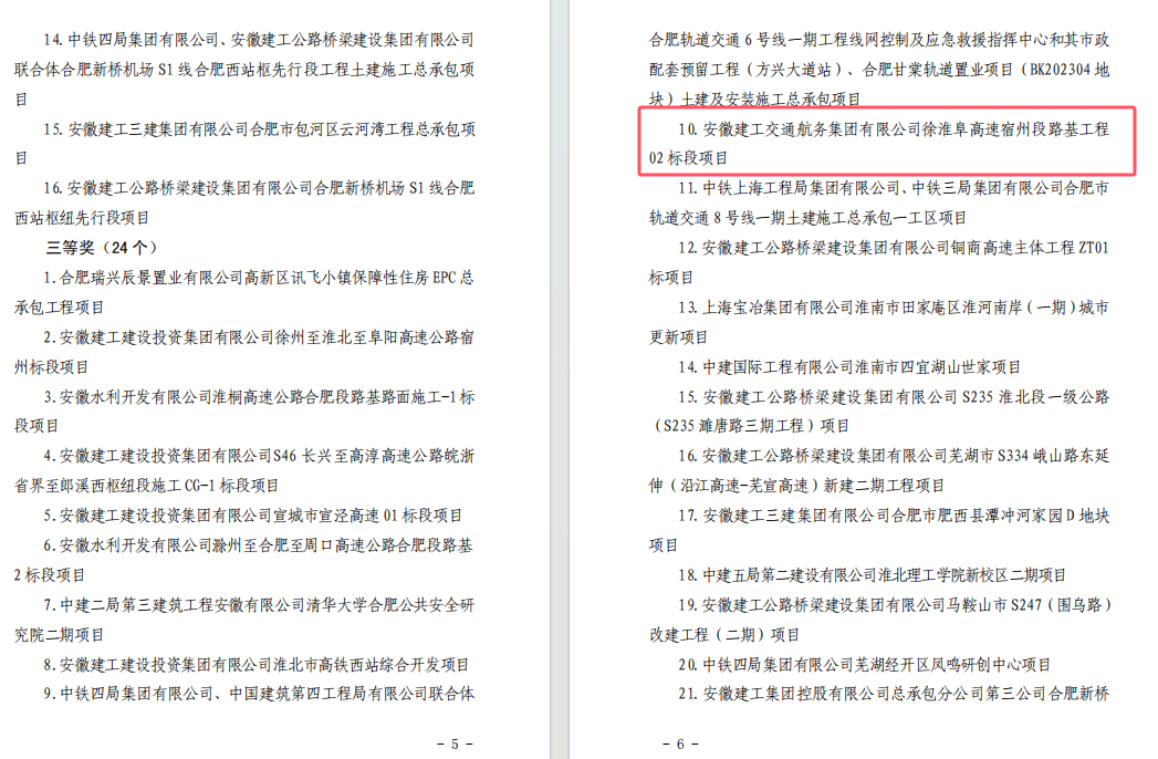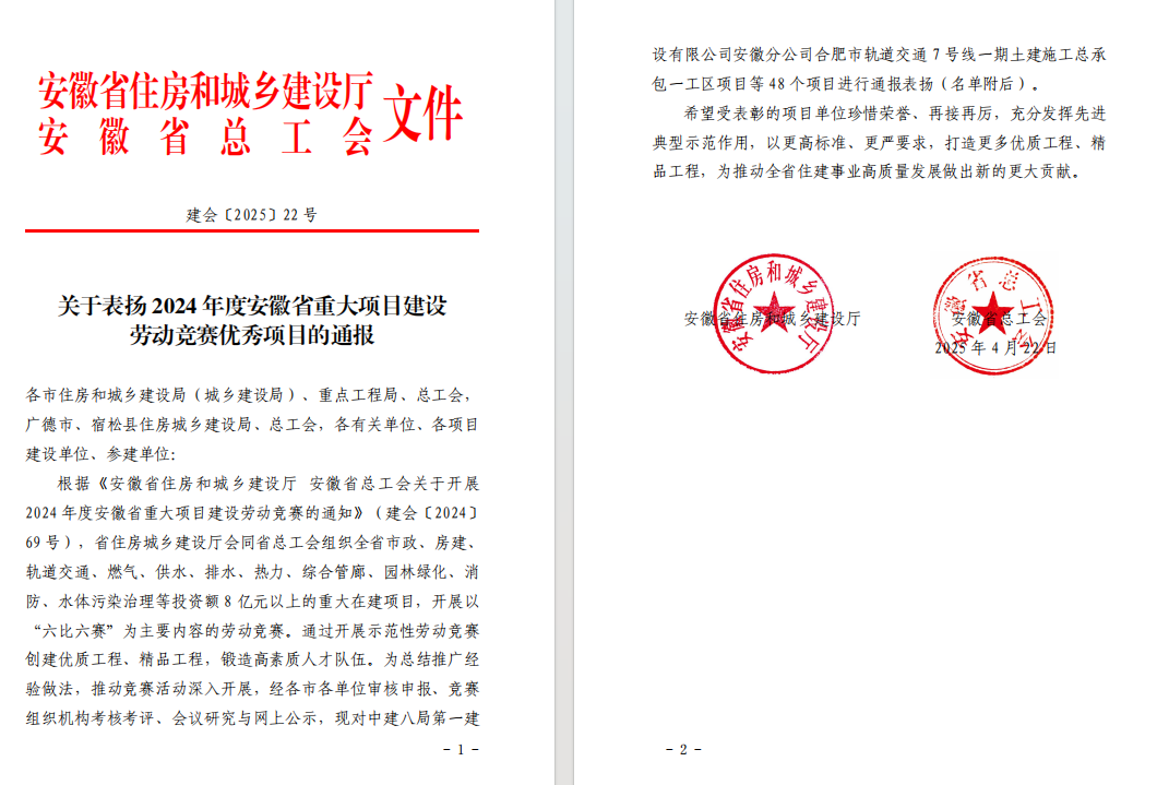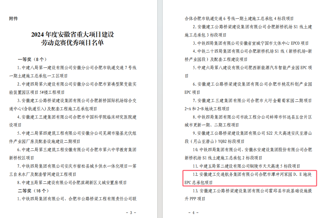 近日,安徽省住房和城乡建设厅、安徽省总工会联合发布《关于表扬 2024 年度安徽省重大项目建设劳动竞赛优秀项目的通报》,公司潭冲河家园 D、E 地块 EPC 总承包项目和徐淮阜高速宿州段路基工程 02 标项目表现突出,成功入选优秀项目名单。