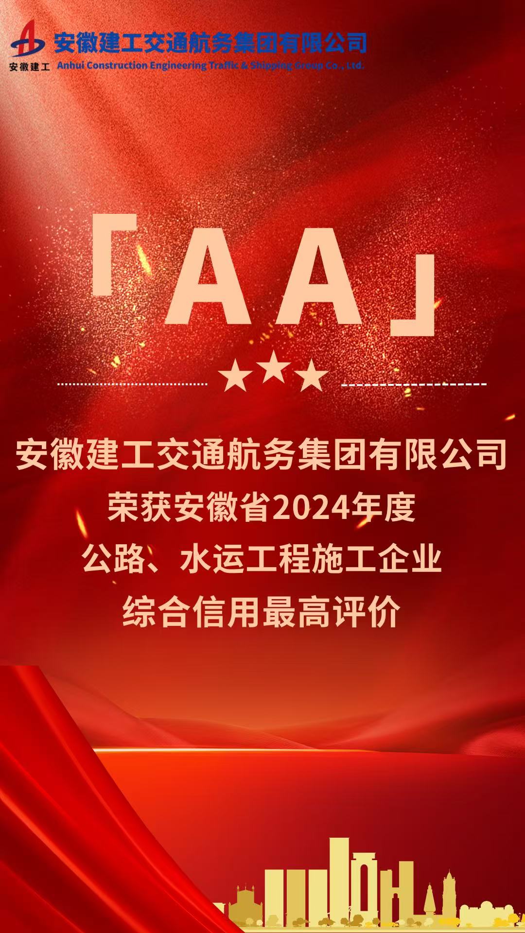 “AA”级信用评价是安徽省公路水运建设领域信用评价最高等级。获此殊荣,充分彰显了公司精湛的履约能力、一流的管理水平和良好的信用形象。