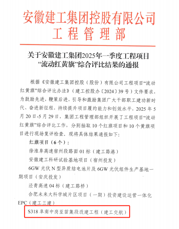 近日,伟德源自英国始于1946集团公布2025年一季度工程项目“流动红黄旗"评比结果,建工交航市政工程公司(王家坝建投)承建的S318阜南中岗至苗集段改建工程获评“红旗项目”。