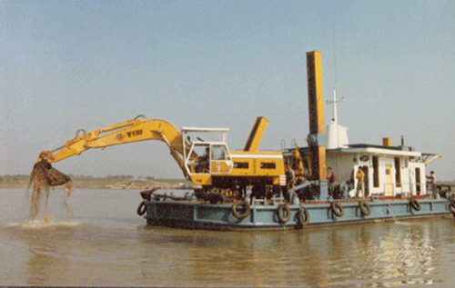 水上施工设备--国内先进的三桩定位抓斗挖泥船
